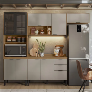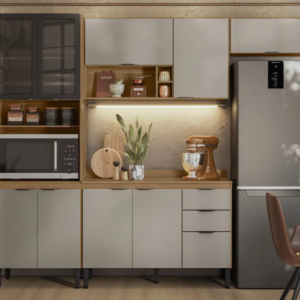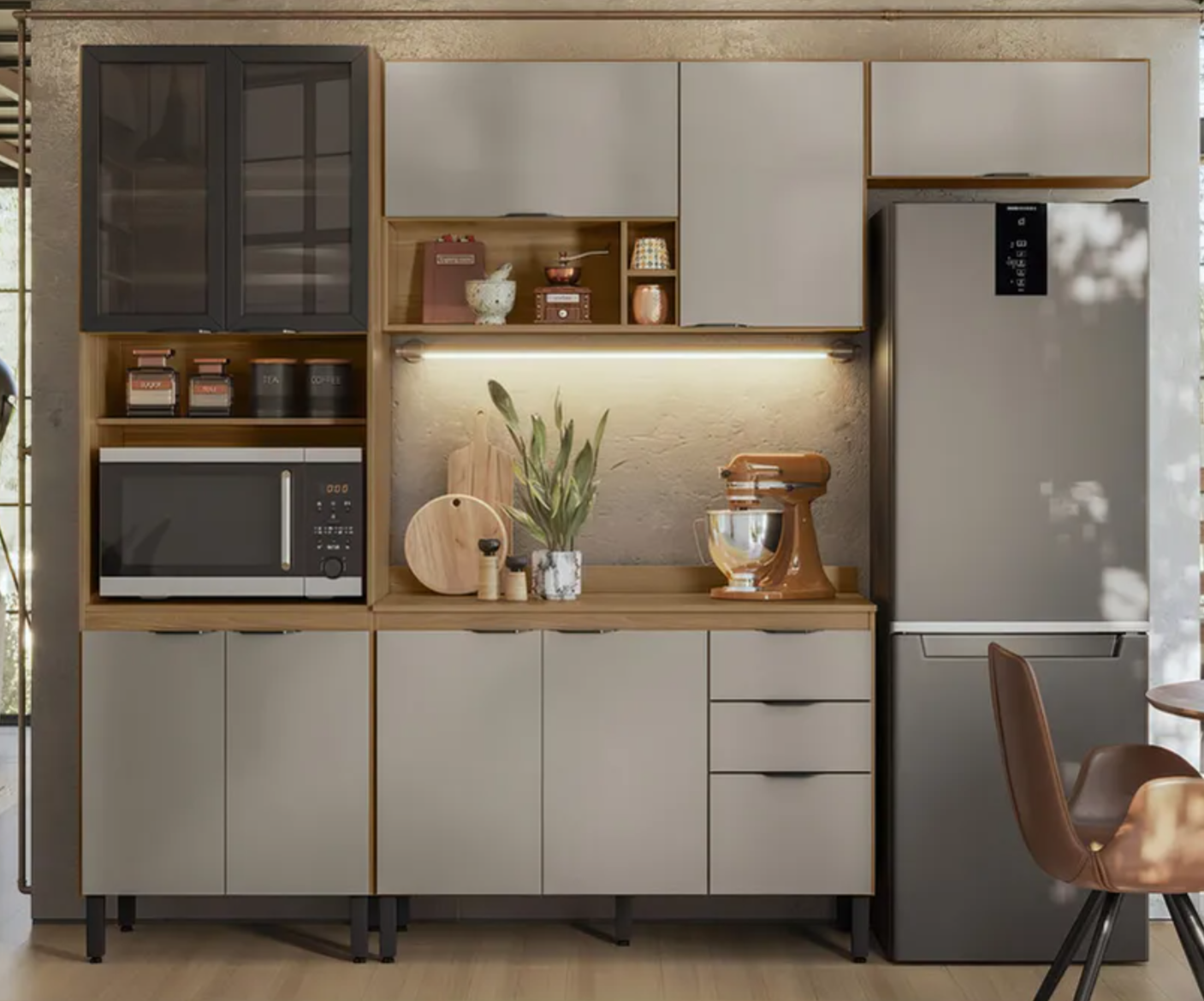 A cozinha modular FIRENZE composição 06 é formada por um paneleiro 4 portas com 2 portas de vidro fume com espaço para forno de até 44L, um aéreo de geladeira 70cm porta basculante com pistão a gás,um aéreo 2 portas 120cm sendo uma com pistão a gás com abertura para cima também com nicho e porta vinhos, um balcão 120cm com 3 portas e 2 gavetas com tampo que pode ser substituído por pia. Seus pés são de polipropileno reguláveis se adequando as condições do chão, puxadores pretos com design moderno, corrediças e dobradiças metálicas. Estruturado em MDP com revestimento ultravioleta e acabamento fosco.