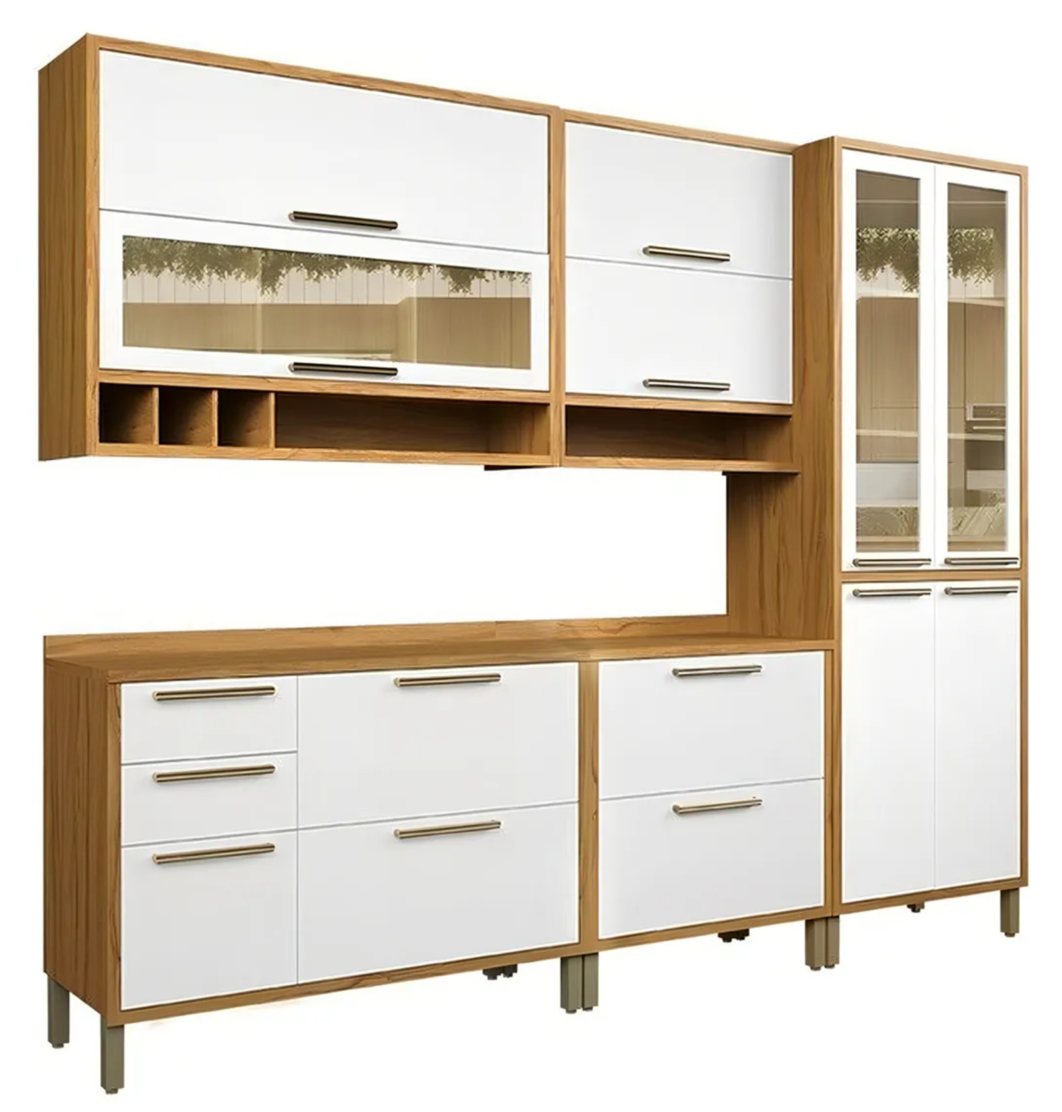 Cozinha Modulada Completa com 5 Peças 11 Portas e Vidro Reflecta 100% MDF Vicenza Espresso Móveis Amêndoa/Branco