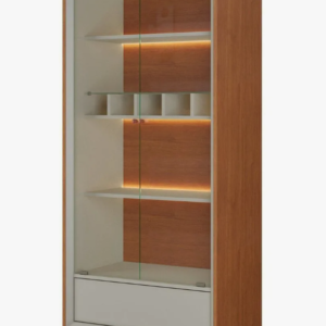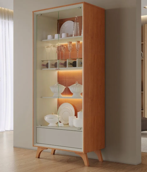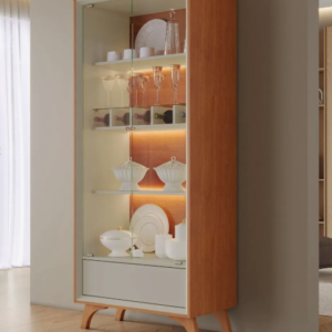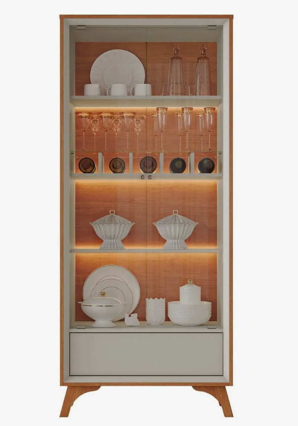 Esta cristaleira une design sofisticado e funcionalidade, com acabamento laqueado que valoriza a peça e iluminação LED para realçar o interior. Possui espaço para adega e uma gaveta para organização. Os pés em madeira maciça conferem estabilidade. Ideal para exibir louças, taças e bebidas com elegância, além de facilitar o acesso. O acabamento laqueado é resistente e fácil de limpar. A iluminação LED é econômica e destaca a decoração.