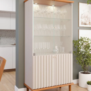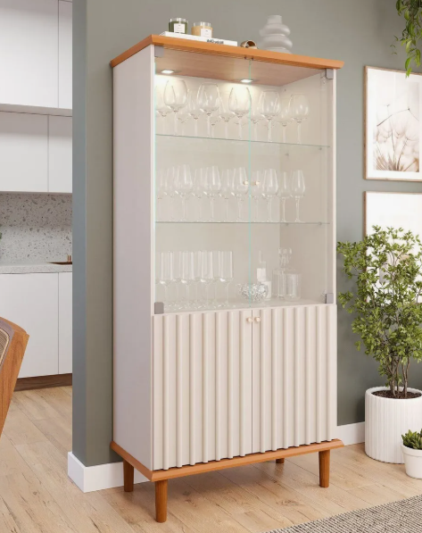 A Cristaleira Luiza é uma peça que combina elegância e funcionalidade, perfeita para valorizar a decoração de qualquer ambiente. Com base em MDF e pés de madeira, oferece estabilidade e um toque natural. Suas portas possuem um design sofisticado: detalhes ripados na parte inferior e vidro na parte superior, permitindo a exibição dos objetos com charme. As prateleiras superiores em vidro oferecem leveza e sofisticação, enquanto o LED na parte superior destaca os itens expostos, criando uma atmosfera acolhedora e refinada.