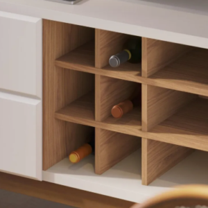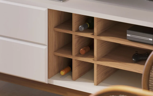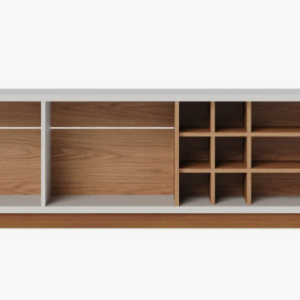 Com um visual urbano e moderno, a bancada rack Noronha é um móvel multifuncional, ideal para compor salas de estar e home cinemas. Com medidas amplas possui um tampo que permite acomodar uma TV de até 70 polegadas ou servir de apoio para livros, adornos, aparelhos eletrônicos e demais objetos decorativos. Disponível nas cores off White matte e preto fosco, possui duas portas com fecho toque e detalhes chanfrados com pintura P.U. Contém também nichos internos, adega com porta-garrafas para até 6 unidades e pés em madeira maciça.