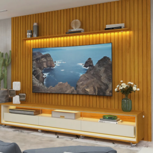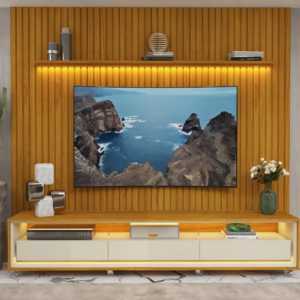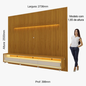 O Conjunto Painel Nobre Ripado Rack Requinte é um combo funcional e moderno que harmoniza com diversas decorações. O painel conta com ripas autênticas 100% MDF e prateleira chanfrada com bordas laqueadas, podendo ser montada na parte inferior ou superior do produto. O rack possui duas opções de pés, em madeira maciça ou rodízios com rodas duplas siliconadas, divisórias em vidro de 8mm e gavetas com bordas chanfradas laqueadas e corrediças telescópicas. O conjunto inclui Led em luz quente com difusor.