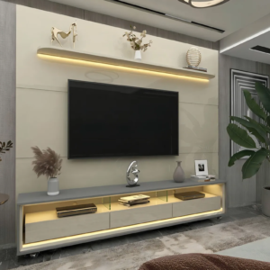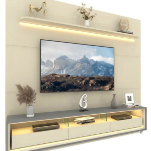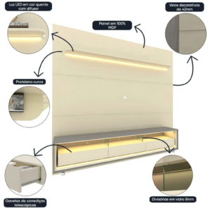 Um conjunto perfeito para sua casa. Com luz LED em cor quente, o painel Royal com rack Requinte traz para a decoração um toque de aconchego e elegância. O painel em 100% MDF tem prateleira de cantos curvos e bordas laqueadas e três veios decorativos. O rack dispõe de três gavetas espaçosas de design flutuante e divisórias em vidro de 8mm. Esta dupla foi pensada para o seu lar.